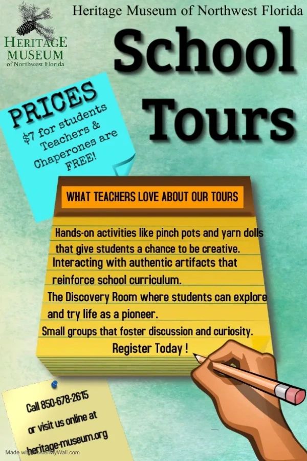 Learn about Native Americans, the Florida Panhandle's original residents, and Pioneers. The tour will explore the similarities and differences between these two groups and how technology and our lifestyles have changed over the years. Students will also have self-guided time in the Discovery room, a hands-on area where students can experience a model one-room schoolhouse, store, and an archaeology dig.