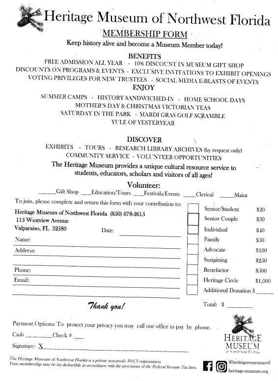 OR CALL 850-678-2615 TO JOIN THE HERITAGE MUSEUM AND BECOME A MEMBER TODAY !